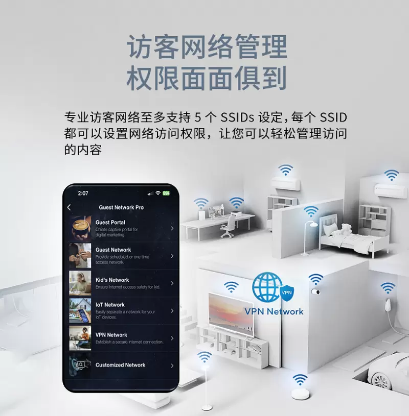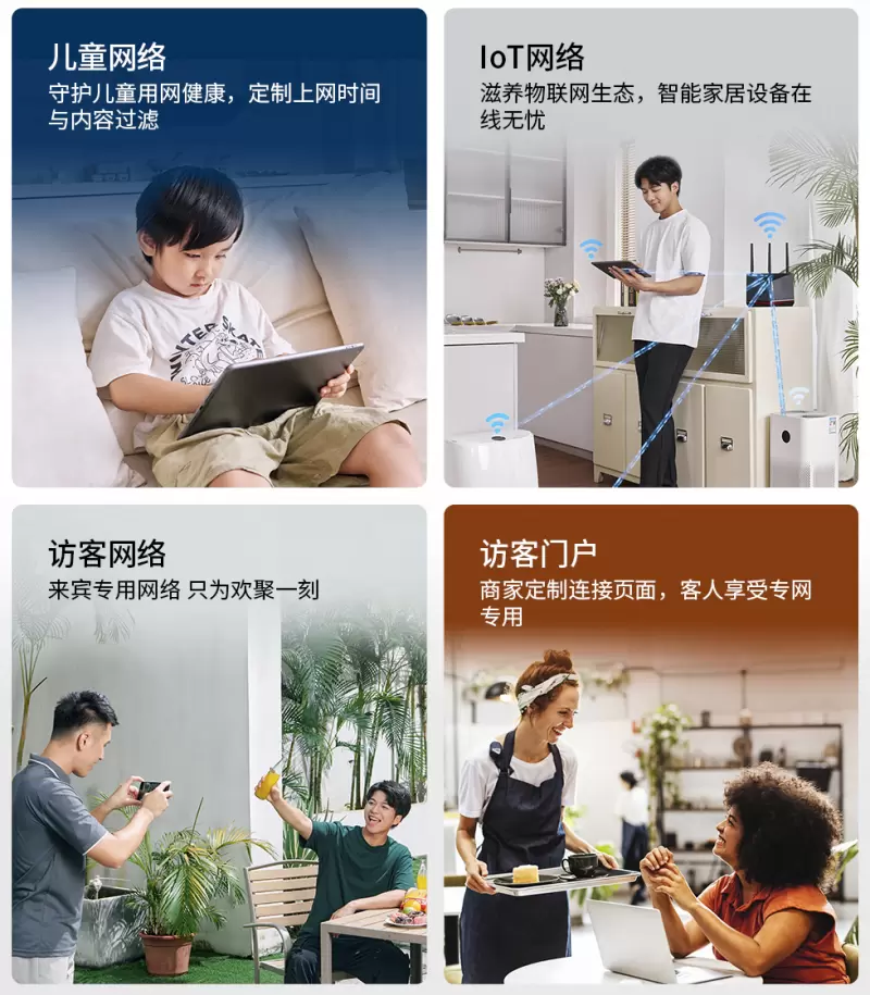 除了硬件上的升级,访客网络管理权限的设计也极为周全。支持设定多达5个SSIDs,每个SSID都可独立设置网络访问权限,还有物联网专用网络、全面的家长管理功能,以及个性化的访客门户。此外,BE86U还支持三大Ai功能:网络神盾、随心组网、智能场景加速。这些功能的加入不仅让我们的网络更加安全、稳定,还能根据不同的使用场景进行智能加速,带来更加流畅的网络体验。