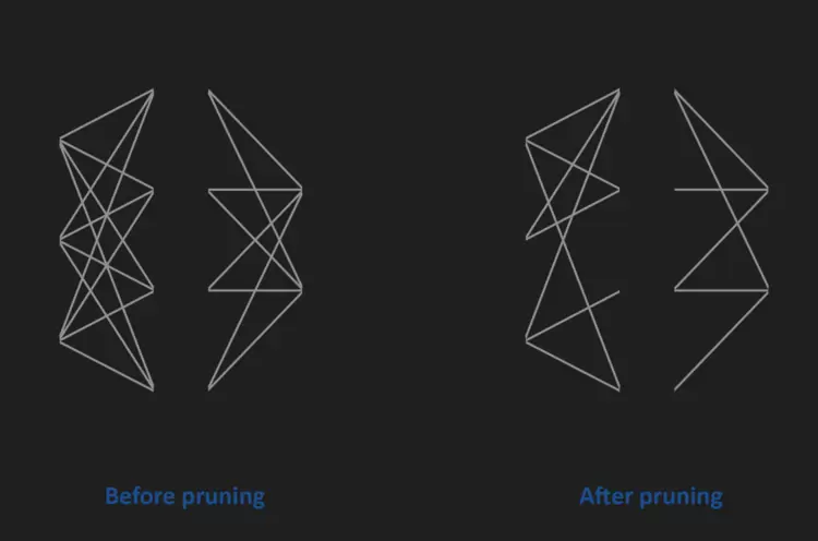 图2——剪枝减少了神经网络的密度。上图中,某些神经元之间的连接权重被设为零。但有时神经元也可以被剪掉(图中未显示)。