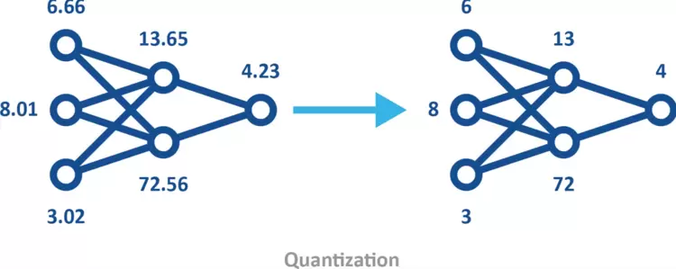量化是另一种流行的压缩技术。量化是将高精度格式(如32位浮点(FP32))的数据转换为低精度格式(如8位整数(INT8))的过程。量化模型(见图3)的使用可以通过以下两种方式之一纳入机器训练。