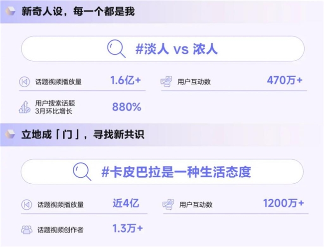 当MBTI成为新的社交密码,年轻人们衍生出了各类“人设”。根据情绪外放程度和浓烈程度而划定的“浓人”和“淡人”概念,在今年得到了创意性的对比演绎,#淡人 vs 浓人 话题视频获得了破亿播放量。基于此,平台与媒体、商家共创“贝加尔淡人妆”春夏趋势,带动相关单品销量增长。与“淡人”相似,卡皮巴拉情绪稳定,被无数年轻人奉为精神偶像,话题视频播放量近 4 亿,衍生“豚门”。众多商家也发明各自的“X门”,给予消费者身份认同。