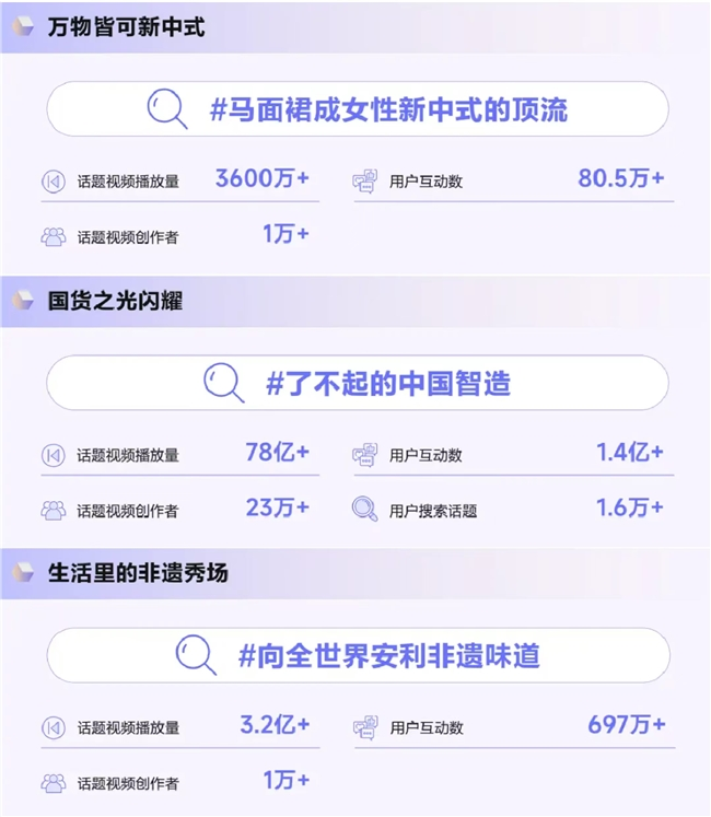 这代年轻人的文化基因在逐渐觉醒。马面裙这类传统服饰被赋予时代活力,重新走入人们日常生活,#马面裙成女性新中式的顶流 话题视频播放量达3600万+。还有非遗文化大放异彩,6月份 #向全世界安利非遗味道 话题视频播放量达3.2亿+,众多非遗手工艺者得到关注,非遗产品销量持续走高。除了文化软实力,国货品牌的科技硬实力为用户带来强烈的民族自豪感,#了不起的中国智造 话题视频播放量达78亿+,帮助国货品牌刷新品牌认知。