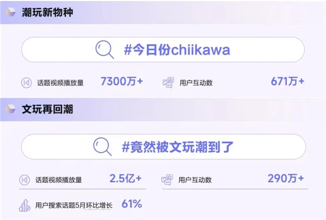 “为爱发电”是当下年轻用户的常态,他们喜欢把情感寄托到各类兴趣爱好上。5月,chiikawa IP热度持续走高,#chiikawa 话题视频播放量已超过72亿次,该主题的手办玩具、棉花娃娃等周边商品需求增长,线下展会和快闪店等形式带来了更加丰富的消费体验。潮流文化之外,年轻用户又将目光转向手串、沉香、葫芦等文玩产品,#竟然被文玩潮到了 话题视频播放量达2.5亿+,参与商家活动期结算GMV提升35%,品牌达人直播间GMV增长达104%。