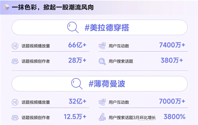 去年 8 月,抖音电商联合《智族 GQ》发布时尚趋势“美拉德风”,带动服饰品牌创新营销方式、优化货盘。#美拉德穿搭 话题视频播放量达66 亿+,仅一周多时间,数十个品牌GMV增长超100%,近百个商品增长1000%以上。同样还有今年2月的“薄荷曼波”,以清新之风激发用户兴趣,话题视频播放量达32 亿+。服饰色系走向折射了用户的情绪特征,帮助商家聚合更多兴趣流量。