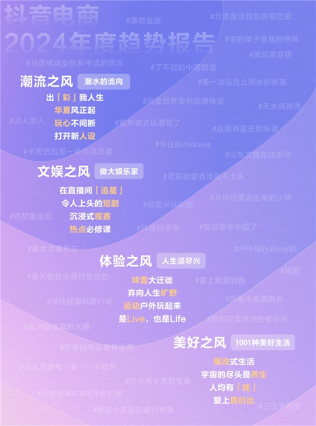 一个新的话题趋势,就是一个新的机会赛道。如今商家不仅需要围绕商品本身,维护好一条大链接;还要聚焦话题趋势,发力一个个小井号。为了帮助品牌掌握以话题带动趋势、用内容撬动生意的经营方法论,抖音电商联合营销媒体SocialBeta发布《造风者——抖音电商2024年度趋势报告》(以下简称“趋势报告”),以潮流、文娱、体验、生活这四大方向为观察切口,回顾和梳理过去一年在抖音电商兴起的话题趋势,并预测下半年的风向变化,为各行业商家提供前置的方法指引。