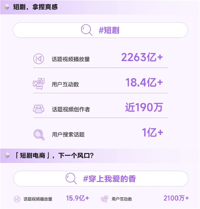 在内容形态方面,短剧以短、平、快的优势获得大量观众喜爱。抖音电商作为微短剧主要播出平台之一,截至目前,#短剧 话题视频播放量已经超过2263亿次,同时平台也通过推出“辰星计划”鼓励更加优质的短剧作品出现。品牌纷纷探索以短剧带货的营销模式,以冠名定制和品牌自制等方式做好产品融入和承接转化,实现品效双赢。