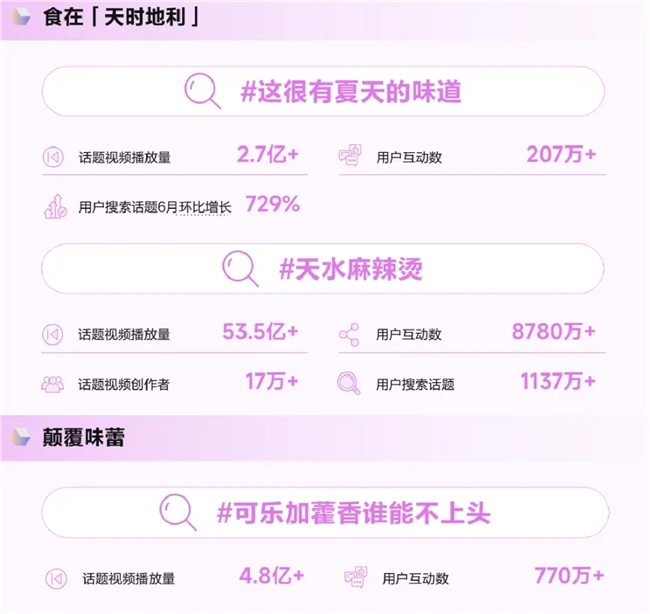 趋势报告显示,消费者在饮食方面追求“天时地利”。#这很有夏天的味道 话题帮助年轻人从燥热天气和沉闷工作氛围中抽离,提供了找回胃口的夏日饮食选择。特色地域美食陆续走红,#天水麻辣烫 上半年搜索话题人次超1137万人次,话题视频播放量达53.5亿+。各类黑暗料理勾起食客的味蕾,太极藿香正气口服液和天府可乐联手推出“藿香味小可乐”赚足眼球,相关话题播放量达4.8亿+。