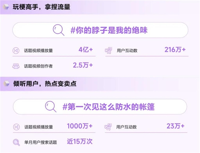 层出不穷的热梗代表了用户对生活的娱乐和戏谑态度。如果品牌能够将热梗灵活地运用在用户沟通中,那么将是一次完美的借势营销。#你的脖子是我的绝味 源于一句说唱歌词,其中有趣的类比联想吸引大量用户围观,视频播放量达4亿+。这个梗一炮而红后,绝味鸭脖更主动下场,邀请范丞丞担任品牌代言人。#第一次见这么防水的帐篷 源于一位用户分享自己的露营经历,话题视频播放量达1000万+,还引来品牌方骆驼现场整活。这群“听劝”的商家成功撬动生意增长。