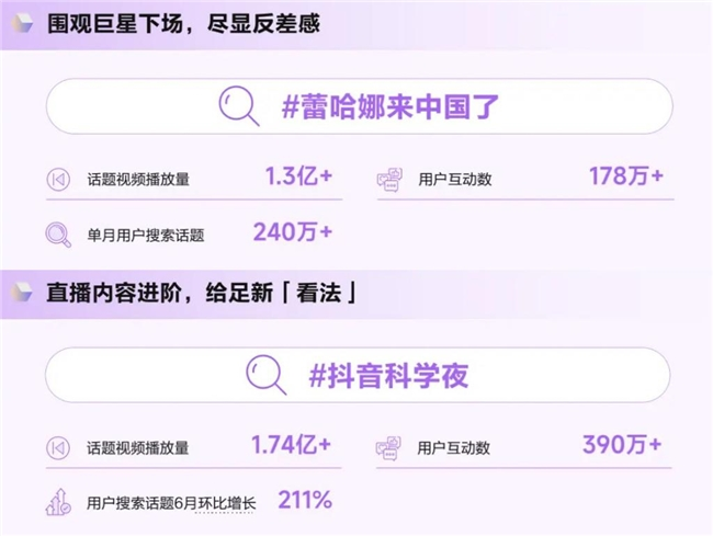 根据趋势报告,过去一年,来自影视、商界、体育、文化等领域的各路名人陆续入驻抖音电商,开创内容活力。5 月,“山东天后”蕾哈娜空降中国贡献了她的抖音直播首秀,接地气的反差感引来网友围观,当晚直播总场观数达到 3800 万+,店铺新客环比增长1400%+。还有越来越多的学者教授也在抖音开播,今年的抖音科学夜邀请9 位科学家,联袂呈现了一场盛大的科普直播,观看人数超过 520 万。