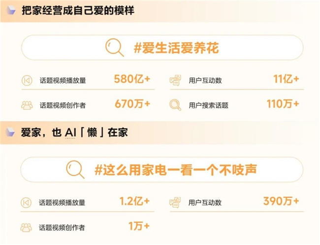现代生活情绪压力倍增,人们对温馨的家居生活有更高的追求。#爱生活爱养花 话题视频播放量超580亿,各地用户交流分享种植心得,分享在家也能感受大自然生机的乐趣。AI时代来临,智能家居产品让大众解放双手,#这么用家电一看一个不吱声 话题播放量破亿,家电品牌华帝依托话题热度实现高曝光,视频引流成交超2000万。