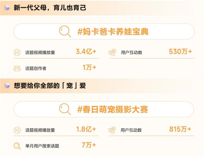 当年轻人当上父母,他们也在探索如何当父母。暑假来临,#妈卡爸卡养娃宝典 话题收获超3.4亿播放量,父母们分享亲子游假期好去处、智能带娃神器、户外运动初体验等一系列带娃实操,与孩子共同成长。而对于“毛孩子”来说,它们的父母希望用照片和视频记录下宝贵的成长瞬间。#春日萌宠摄影大赛 吸引大家来晒娃,话题播放量达1.8亿+。