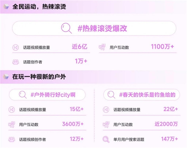 与大自然亲密接触,是现代都市人的休闲方式,也表达了自己的生活态度。年初《热辣滚烫》登顶春节票房冠军,激发了大众的运动热情和对自我蜕变的期望,#热辣滚烫爆改 话题视频播放量近6亿。同时大众对运动户外的定位不再局限于强身健体,而向着兴趣满足、社交互动等更多维度延伸。#户外骑行好city啊 话题播放量超15亿,#春天的快乐是钓鱼给的 话题播放量超22亿,成为年轻人的新晋爱好。