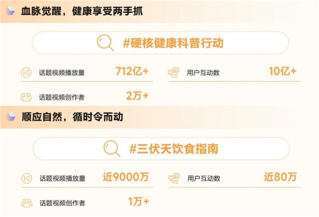 这届脆皮年轻人意识到健康重要性后,已经走上养生的道路了。抖音健康发起多轮#硬核健康科普行动,邀请在职医生分享健康知识,话题视频播放量超700亿。新中式养生在三伏天期间得到重视,不少健康达人分享自己经实践检验的养生方法,各类消暑攻略帮助品牌向用户实现深度种草。