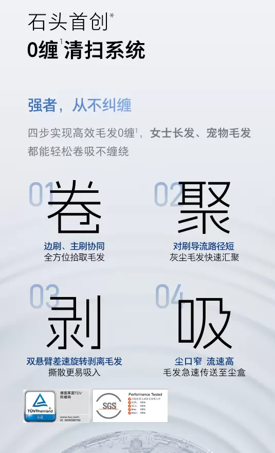 对很多家庭来说,打扫房间时最困扰的,莫过于附着在地板上打扫了很多遍依旧很难完全清除的头发、垃圾等。此次,石头P20Pro首创0缠清扫系统,通过“卷、聚、剥、吸”四步实现高效毛发0缠,长头发、宠物毛发都能轻松卷吸不缠绕。