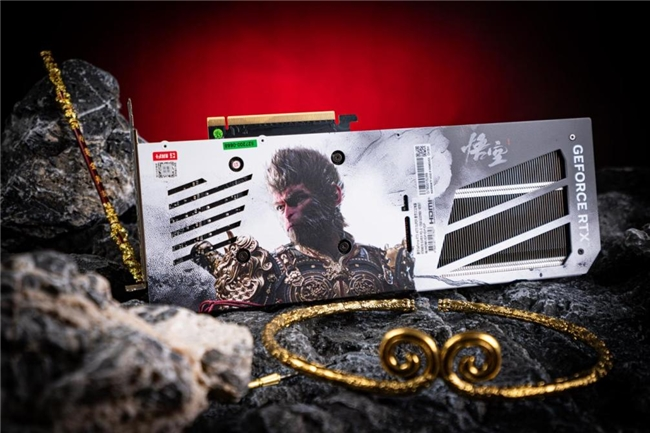 这款显卡的背板设计是其最大的亮点,灵感来源于《黑神话:悟空》的水墨画风,巧妙地融入了丰富的中华传统文化元素。在工艺上,显卡采用了创新的穿透式散热系统,背板右侧特别加大了镂空面积,使得第三个散热风扇的风流可以无阻地穿过散热鳍片。此外,镂空的PCB设计,大大提升了散热效率,有效降低了显卡的工作温度。