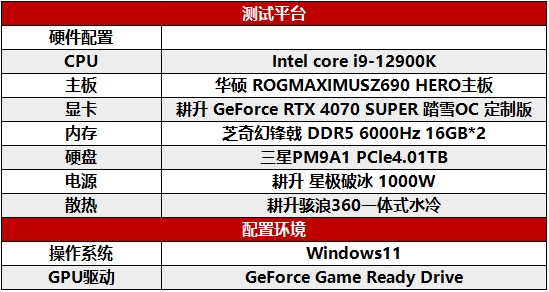 为了充分发挥显卡的潜力,在本次测试中,我们选择了强大的Intel Core i9-12900K作为配套处理器。同时搭配了ROG MAXIMUS Z690 HERO主板,并使用了两条速度为6000Hz的芝奇幻锋戟DDR5 16GB内存。此外,我们还选用了耕升星极破冰1000电源。这套以耕升硬件为基础的测试平台,在各个方面都能满足我们的需求,耕升 GeForce RTX 4070 SUPER 踏雪OC 定制版的性能也将在这个平台上得到完美的展现。