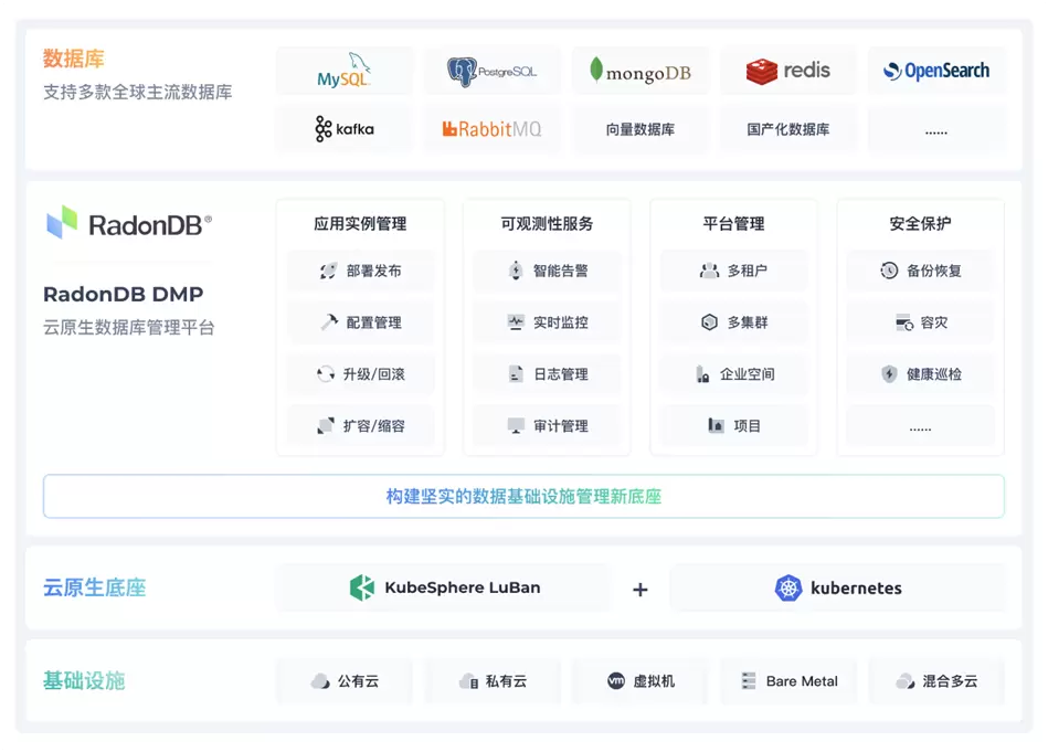 RadonDB DMP 在 KubeSphere LuBan 云原生可扩展开放架构之上,能轻松实现多类型主流数据库的跨云部署、统一运维、智能监测与自动化保护等,完整构建围绕高性能、高可用、业务追踪、数据流转等场景下的生态闭环,助力客户真正实现数据库即服务 (DBaaS)。