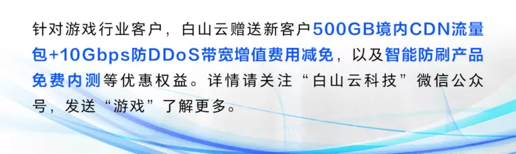 白山云是全球领先的边缘云服务提供商,为客户提供网络、安全与计算一体化的边缘云服务。深耕游戏行业多年,白山云深度理解客户业务,针对突发大流量压力、高额带宽成本、大规模DDoS攻击、流量频遭盗刷、出海业务挑战多、售后服务难保障等游戏类客户核心需求与痛点,从技术和成本层面持续打磨行业解决方案,助力国内游戏厂商打造精品爆款、加速全球化进程。