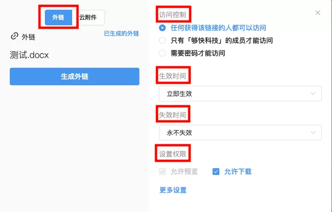 文件转换成外链/云附件外发前,设置好访问密码、有效期、打开次数、下载权限等安全机制,让流转可控。