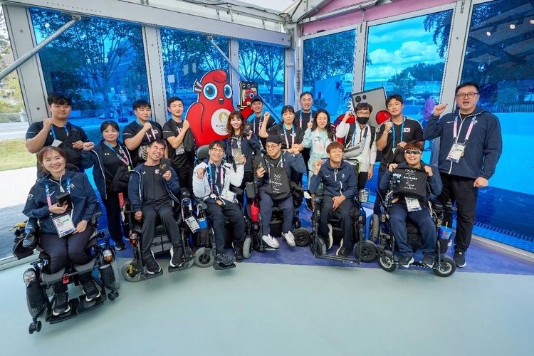 ▲ 来自韩国的残奥运动员在残奥村的三星体验区领取三星 Galaxy Z Flip6 奥运版后合影留念。