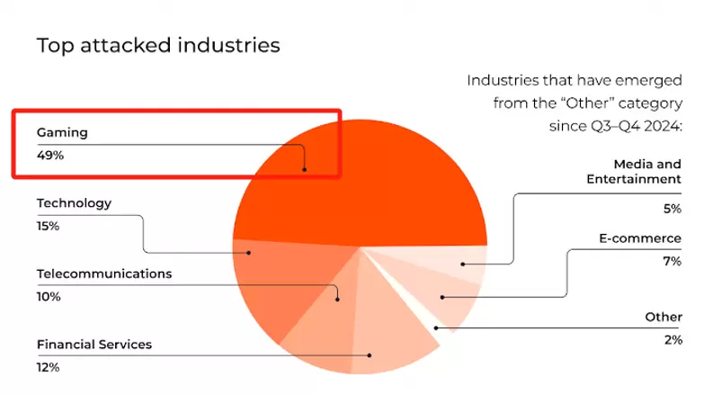 数据显示,2024年上半年的DDoS攻击事件数量显著增加,攻击事件数量达到了44.5万起,同比增加了46%,环比增加了34%。游戏是DDoS攻击的主要目标,占到2024年上半年事件总数的49%,技术行业受到的攻击数量也大幅增加,占到了总数的15%。