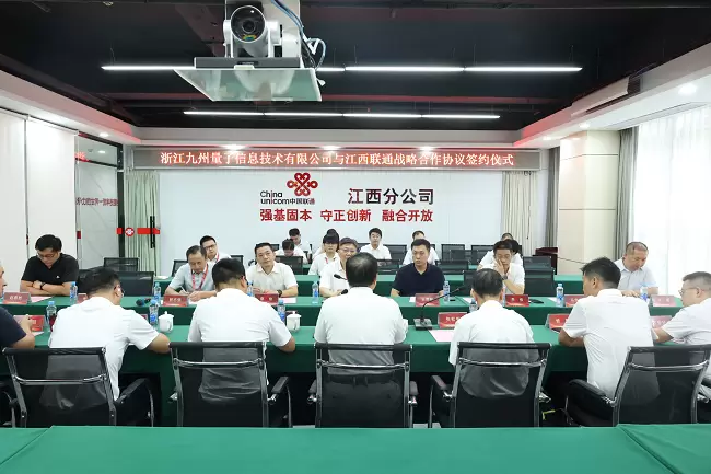 2024 年 8 月 27 日,江西联通与浙江九州量子信息技术股份有限公司正式签署战略协议。在集团研究院和智研院的共同见证下,江西联通党委书记、总经理周智与浙江九州量子信息技术股份有限公司创始人、总裁郑韶辉出席了签约仪式。江西联通党委委员、副总经理张伟与浙江九州量子信息技术股份有限公司副总裁张松平代表双方进行签约。