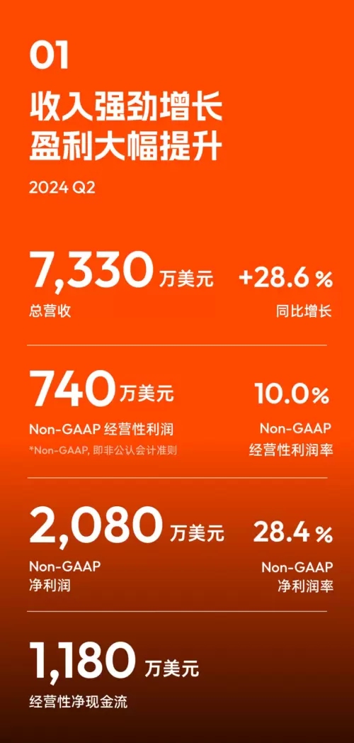 第二季度,总营收达7,330万美金,同比增长约28.6%;非公认会计准则(Non-GAAP)经营利润为740万美元,利润率10.0%,公司历史首次实现季度Non-GAAP经营性盈利。Non-GAAP 净利润为2,080万美元,净利润率为28.4%,创下季度新纪录。
