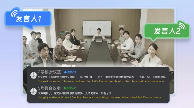 在混合会议场景下,线下会议室里多人并坐、仅有一个小窗口画面,此时线上参会人很难辨别出是谁在说话,导致开会体验不佳。遇到会议要点多、时间长时,会议的组织者也很难按照不同发言人去整理会议纪要。