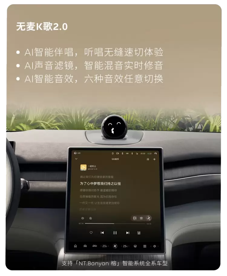 值得关注的是,蔚来Banyan 3.0.0版本推出的无麦K歌2.0,通过QQ音乐AI智能伴唱技术,用户可以在车内轻松实现听、唱无缝切换,结合无麦K歌2.0的6种智能音效和歌词卡片显示及氛围灯音乐随动功能,进一步增强了车内的趣味互动体验,实现了从座舱音乐到座舱音娱互动的玩法升级。