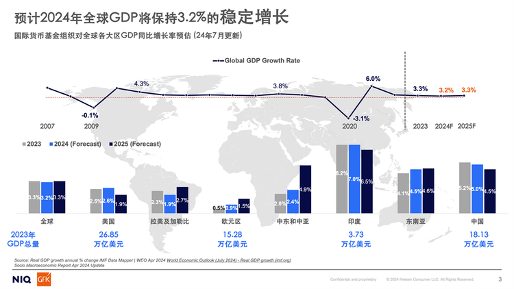 根据国际货币基金组织最新数据,2024年全球GDP将保持3.2%的稳定增长。这一增长率在全球各大区域中表现出一定的差异,在美元区、欧洲区、中东和中亚、东南亚,今年的预测数字与去年相比有不同程度的提高,表明不同地区的经济复苏和不平衡性。