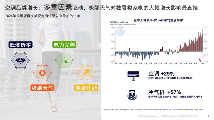 2024年很可能再次被视为有记录以来最热的一年,空调市场受极端天气、电力设施的完善、低渗透率、健康功能需求等多重因素驱动大幅增长。今年上半年,全球冷气机销售额(以美元计,以下同)同比增长57%;印度空调市场表现较好,销售额同比增长29%。