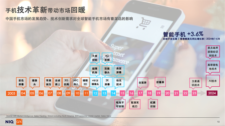 中国手机市场的发展趋势、技术创新需求对全球智能手机市场有着深远的影响,今年上半年,全球智能手机零售额同比增长3.6%。增长的主要驱动力来自于技术,2022年手机厂商推出卫星通信技术,到现在的AI技术、高密度电池技术和单点超声波指纹识别技术等,这些都在推动中国智能手机走向新的高度。