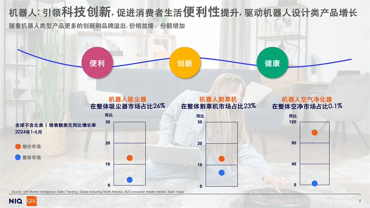 机器人产品越来越多的科技创新和品牌溢出,大大提升了消费者生活的便利性,驱动了机器人设计类产品的增长。品牌溢出更多是指中国品牌,由于机器人技术驱动使得中国品牌的价格增长放缓,但市场份额却在不断增加,机器人吸尘器、机器人割草机市场占比正在稳步提升。以机器人吸尘器为例,今年上半年其销售额同比增长率达到了13%,在整个吸尘器市场的销售额占比达到26%。当下的市场中,只要加上“机器人”这三个字,产品的市场占比和同比增长率都会有显著提升,背后驱动因素就是消费者对便利性、健康度的关注,以及生产企业对产品技术不断创新的追求。