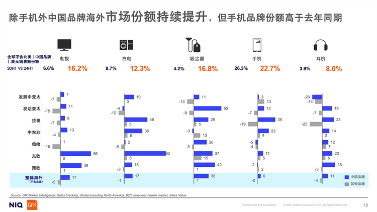从具体品类来看,除手机外,近年来中国品牌的海外市场份额持续提升。2024年上半年,中国品牌的电视、白电和吸尘器产品在全球市场销售额占比均超过10%,相比2020年大幅提升;中国品牌手机销售额占比达22.7%,相较去年同期也有所提升。