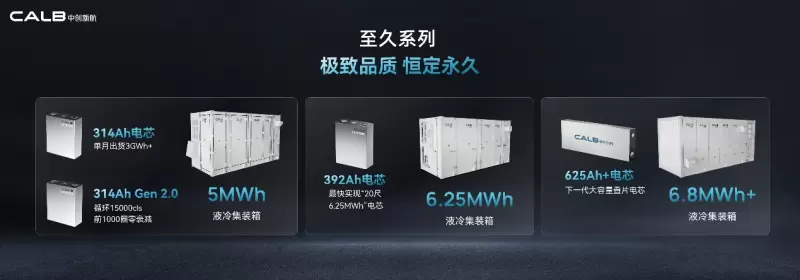 “至久”系列新品中,第二代314Ah储能电芯,在行业首次实现量产产品循环寿命15000次,并实现前1000圈“零衰减”;第三代392Ah储能电芯,能够实现与现有电芯产线全兼容,集装箱相关零部件技术可以和5MWh集装箱产线技术全兼容,是支撑6.25MWh集装箱解决方案行业内最快量产电芯;采用新工艺的625+Ah储能专用电芯,能量密度440Wh/L以上,进一步实现20尺标准集装箱6.8Mwh以上的电量,可大幅提升电站投资回报率。