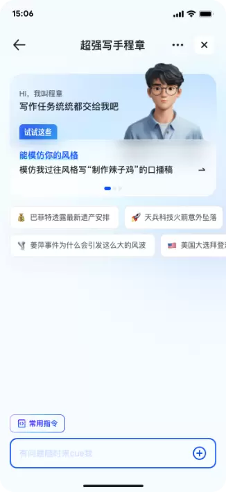 在网页版,CueMe的“超强写手程章”更是把“超能写”的特性发挥到了极致,能结合文件上传、素材加工、网络时效性信息进行高效创作,大大提升用户生产力。