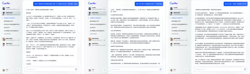 文学创作:CueMe“超能写”的写作创作能力令人瞩目。面向学生、白领、自媒体工作者等不同人群,CueMe可以支持完成多种体裁的创作。无论是严谨规范的论文、细节详实的报告、感悟深刻的读后感、情节跌宕的小说、网感十足的文案,都能轻松完成。其强大的创作能力仿佛一位才华横溢的作家,能够用生动的语言、巧妙的构思为用户打造出一篇篇精彩的作品。更是支持长达2万字长文创作,为用户带来了全新的创作体验,让用户能够在广阔的文字世界中尽情挥洒自己的创意与情感。同时移动端还支持用户一键导出,便于分享和二次加工。