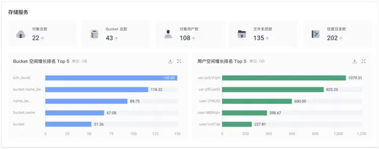 全面展示平台上的对象数、桶总数、用户总数等核心资产指标,让您对整体存储资源的规模与分布有宏观把控。