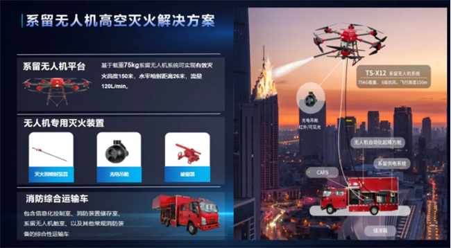 卓翼智能民用场景最为突出的是针对高层消防灭火推出了「超大载重高烈度环境特种智能系留无人平台」,可有效解决150米以上的城市高层建筑消防灭火问题。