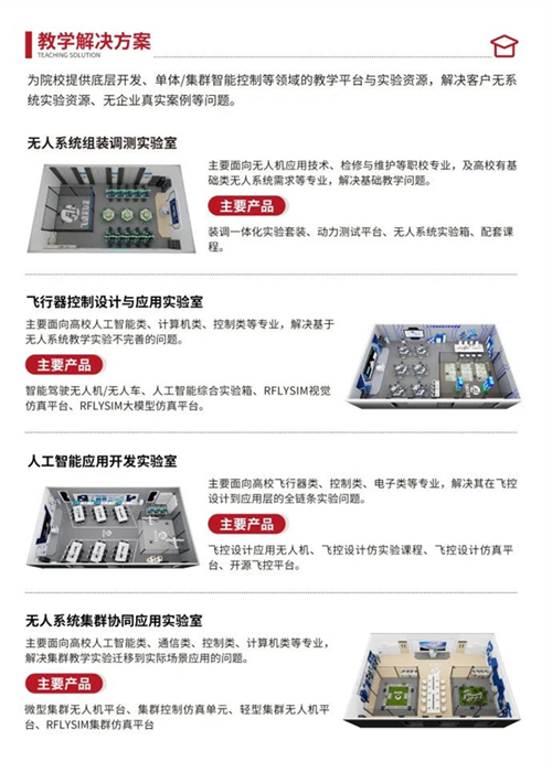 【教学解决方案】主要针对飞行器、自动化、计算机、人工智能等相关专业,提供无人机教学实验室解决方案,为院校提供底层开发、单体/集群智能控制等领域的教学平台与实验资源,解决用户无系统实验资源、无企业真实案例等问题,助力打通校企产学研用创协同发展。