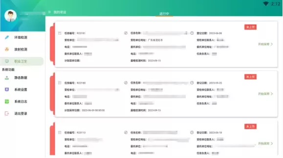 根据合同要求,科室负责人把相关检测任务实时下分到各检测人的账号下,检测人将现场数据进行登记并最终把现场仪器测读出的值导入到系统中从而出具原始记录并审核。