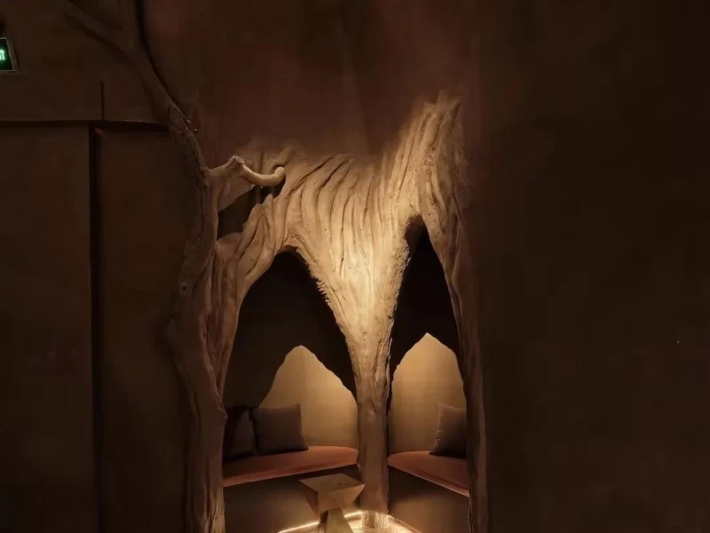 一层的“ROOT本”,寓意生命之树的根基,整体设计模拟岩洞风貌,通过岩石与木材元素的巧妙结合,营造出原始自然的氛围。灯光于其中扮演了重要角色,通过局部照明设计,勾勒出空间的轮廓重点,使得整个空间明暗有度,既保留了神秘与深邃的感觉,又突显了自然的质朴美感。