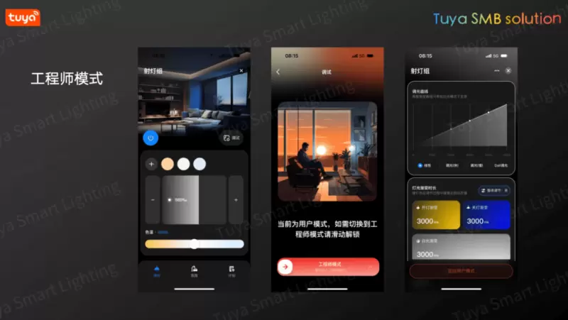 例如,在调光方面,由于传统灯光通常遵循线性的亮度变化模式,在亮度较低的区域,即便是极其微小的参数变动,人眼也能敏锐地察觉到光线的变化。为了优化这一体验,涂鸦SMB照明解决方案引入了工程师模式。在该模式下,SMB Pro驱动能够支持对调光曲线的自定义配置。这意味着,其可根据不同产品的调光特性,通过先进的算法,智能控制灯光调节,确保灯光过渡得更加平滑自然,从而为用户带来更加舒适、愉悦的视觉效果。