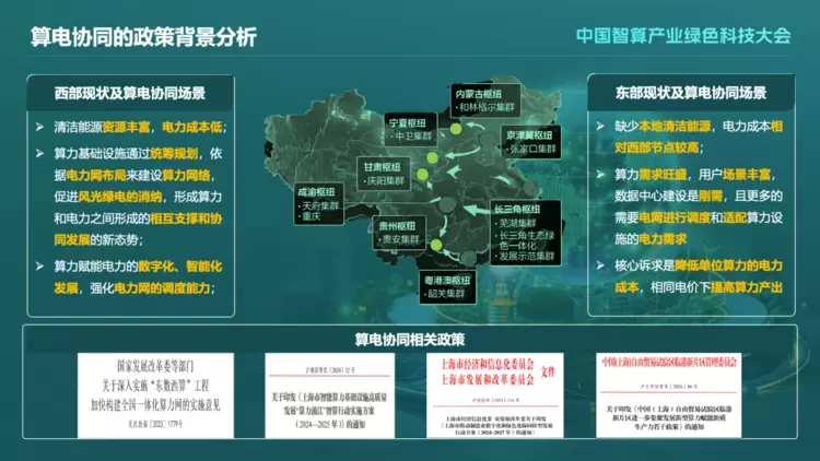 算电协同的出发点在于通过集约化的AI基础设施建设和运营,降低全生命周期成本(TCO)。提升系统负载率优化算力利用率、通过合理选址和绿电接入降低电费成本,均是实现算电协同的有效手段。国家“东数西算”工程,更为算电协同提供了政策东风。在我国,西部电力成本相对低廉,清洁能源资源丰富,但应用场景相对较少,需要更多算力基础设施来促进清洁能源的消纳;而东部虽然清洁能源资源相对较少,但用户场景丰富,有着大量的算力需求。西部丰富的清洁能源与东部旺盛的算力需求,形成了良好的互补关系。