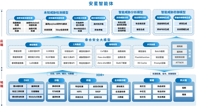 在威胁检测层面,安星智能体利用大模型的环境感知、意图理解和工具调用能力,智能化调度各种检测工具和算法,大小模型协同应用,将AI能力融入到威胁检测与响应的每个环节,大幅提升威胁检测的应对能力和反应速度。