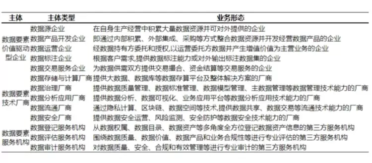 数据要素价值驱动型企业是以数据资源为基本载体,以数据价值释放为核心目标,参与数据生成、流通、增值利用的企业,具体可分为数据源企业、数据产品开发企业、数据运营企业、数据标注企业、数据交易服务企业等。数据要素技术厂商是以数据技术为核心能力,为数据开发利用各环节提供技术工具、平台或技术实施服务等内容的企业,具体可分为数据存储与计算厂商、数据治理厂商、数据分析应用厂商、数据流通厂商、数据安全厂商等;数据要素服务机构则是不直接参与数据开发利用过程,而提供登记、评价、审计等专业服务的第三方机构,大多需要具备开展特定业务的专业资质,具体可分为数据登记服务机构、数据评估服务机构、数据审计服务机构等。