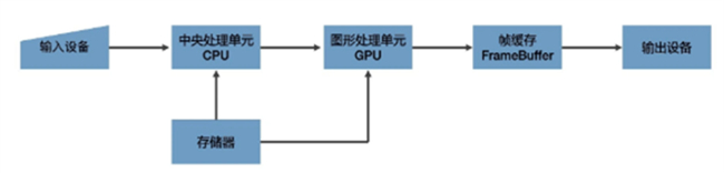 一个通用计算机图形系统主要包括6个部分,分别是输入设备、中央处理单元、图形处理单元、存储器、帧缓存和输出设备。