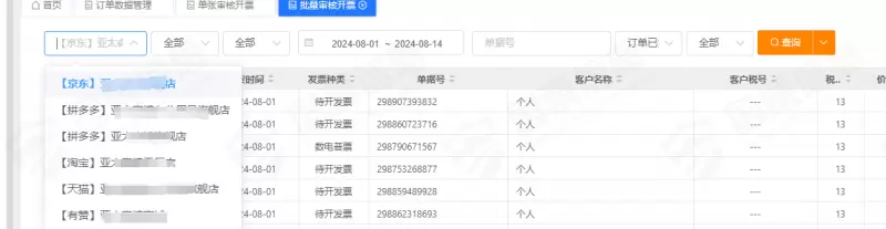 电商销售型的企业,通常会在多个电商平台上开店铺,如淘宝、天猫、京东、抖音等,通常订单都生成在各自平台,开票也在各自平台操作,由于各大电商平台存在竞争关系,导致订单与开票无法归集,管理不便。