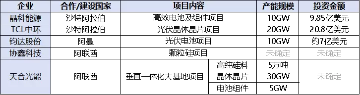 光伏行业公开信息显示,目前已有多家企业公布了海外产能项目,计划于当地开展光伏产能建设,详细的项目信息统计如下表(企业以最新公告时间由近及远排序):