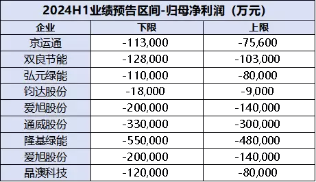 2023年,产业链各制造环节产能快速释放,供需比进一步恶化,光伏产品价格加速下跌;2024年上半年,光伏行业产能过剩加剧,多环节从成本竞争逐步转向现金流竞争;至第二季度,主产业链各环节进入销售价格与成本倒挂、净利润亏损阶段;6月底,已步入现金成本亏损阶段,光伏产业链业绩普遍承压。据统计,2024年上半年光伏产业链各环节部分企业的利润情况如下表(企业排名不分先后):