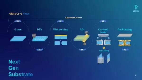 玻璃基板制程涵盖玻璃金属化(Glass Metalization)、后续的ABF压合制程,以及最终的玻璃基板切割。在玻璃金属化,Glass Core中一制程涉及TGV(Through-Glass Via)、湿蚀刻(Wet Etching)、AOI光学检测、镀膜(Sputtering)及电镀(Plating)。玻璃基板的尺寸为515×510mm,无论在半导体和载板制程中均属于全新制程。
